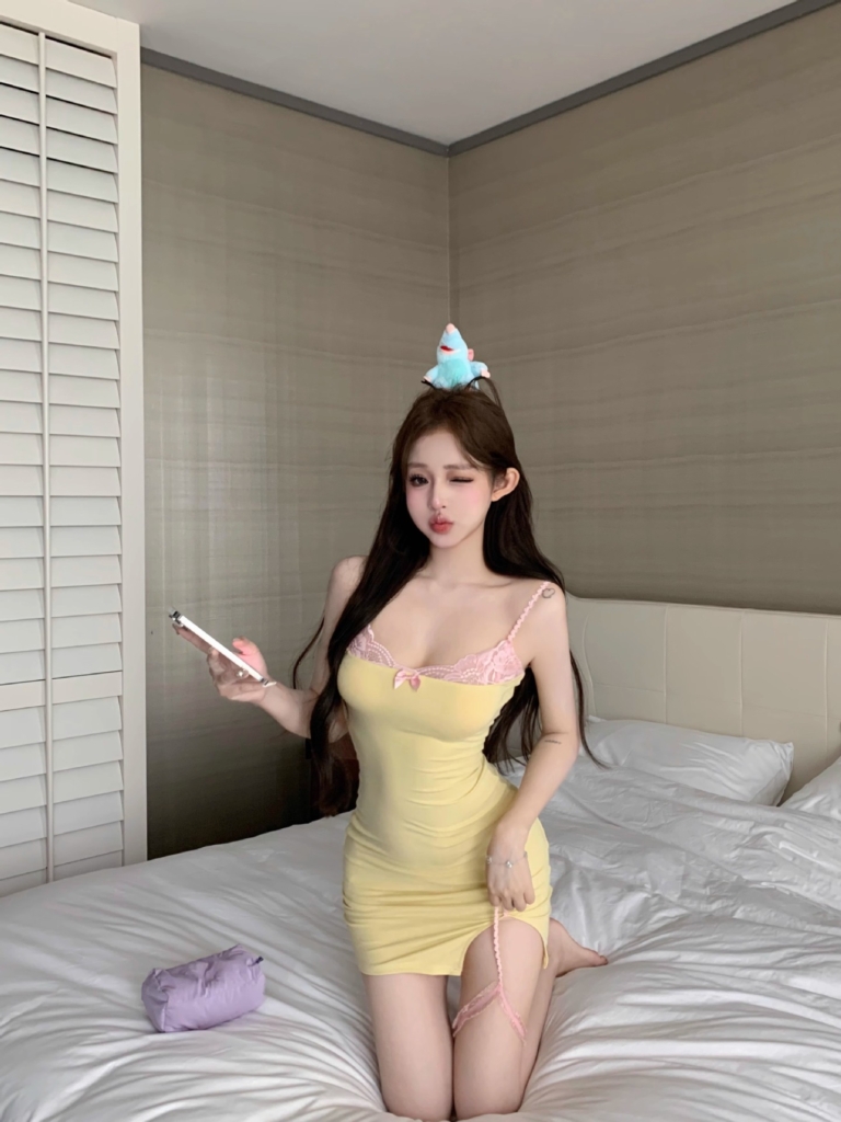 洋裝的吊帶部分加入細緻蕾絲邊,使整體甜美度大大提升,搭配微辣的貼身包臀版型,呈現剛剛好的純欲氛圍,不會過度暴露卻非常吸睛。收腰與貼身剪裁能自然顯出身形線條,讓比例更俐落、視覺更顯瘦 ✨。