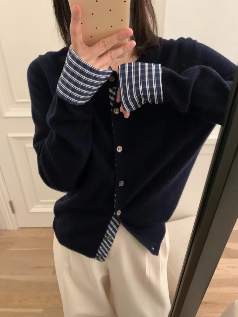 春秋冬韓系減齡撞色格紋拼接針織開衫|女款單排扣外套上衣